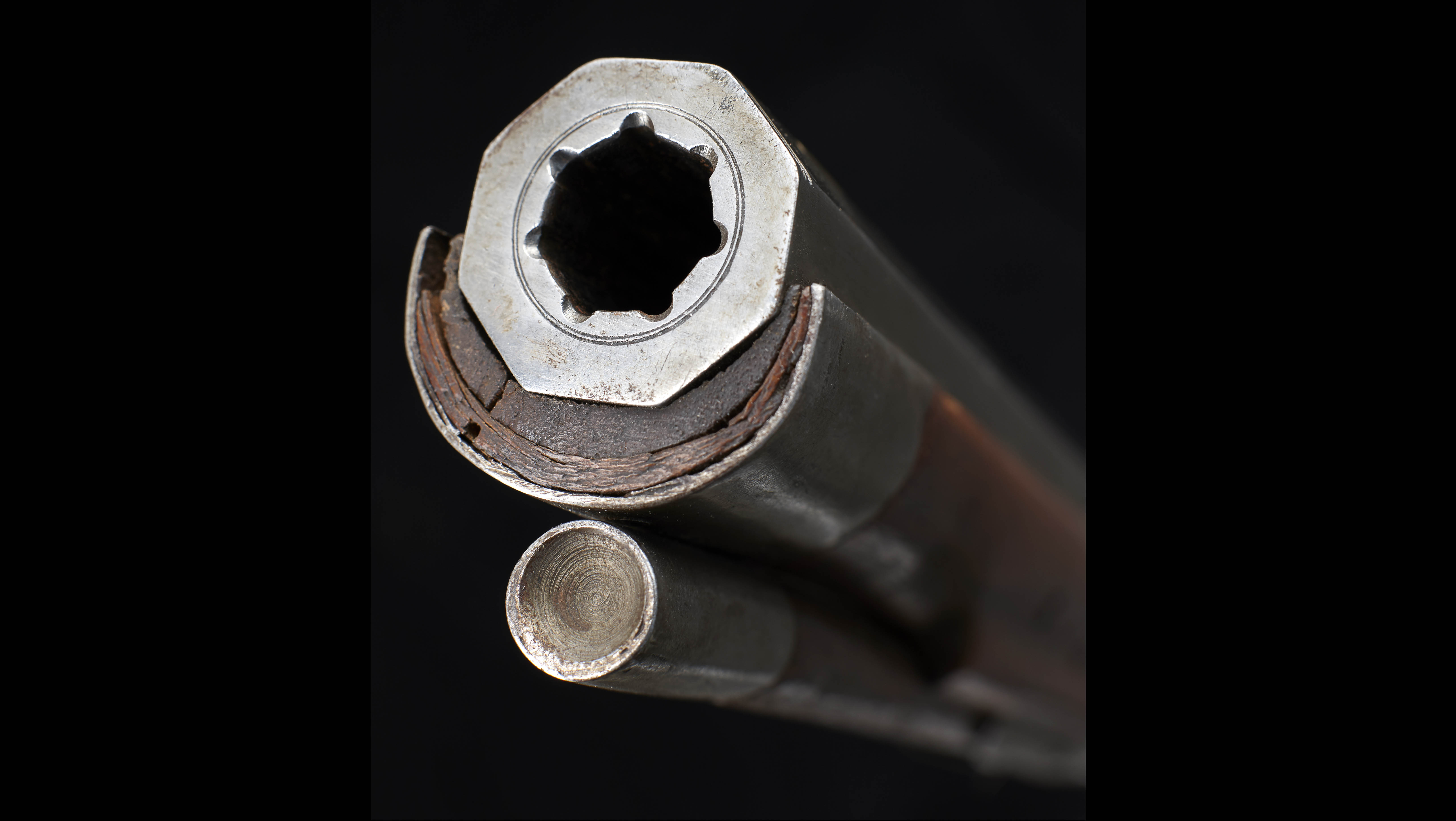 Oktogonaler Lauf mit einigen Gravuren in Höhe der Kammer, gezogen, mit Kimme und Korn (Messing). Glattes Schlossblech, profilierter und gravierter Radkasten aus